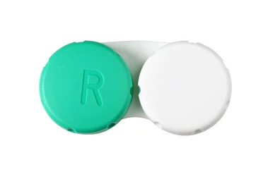 Traditsiooniline läätsekonteiner kontaktläätsede hoidmiseks, roheline-valge.